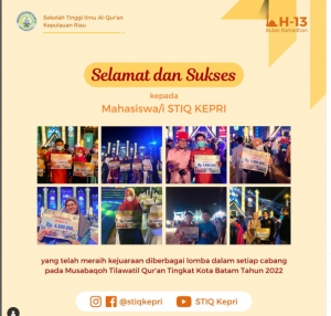 Selamat dan Sukses kepada Mahasiswa/i STIQ Kepri yang telah meraih kejuaraan diberbagai lomba dalam setiap cabang pada Musabaqoh Tilawatil Qur’an Tingkat Kota Batam Tahun 2022.
